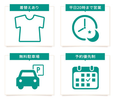 着替えあり、平日20時まで営業、無料駐車場、予約優先制。